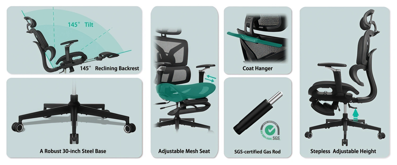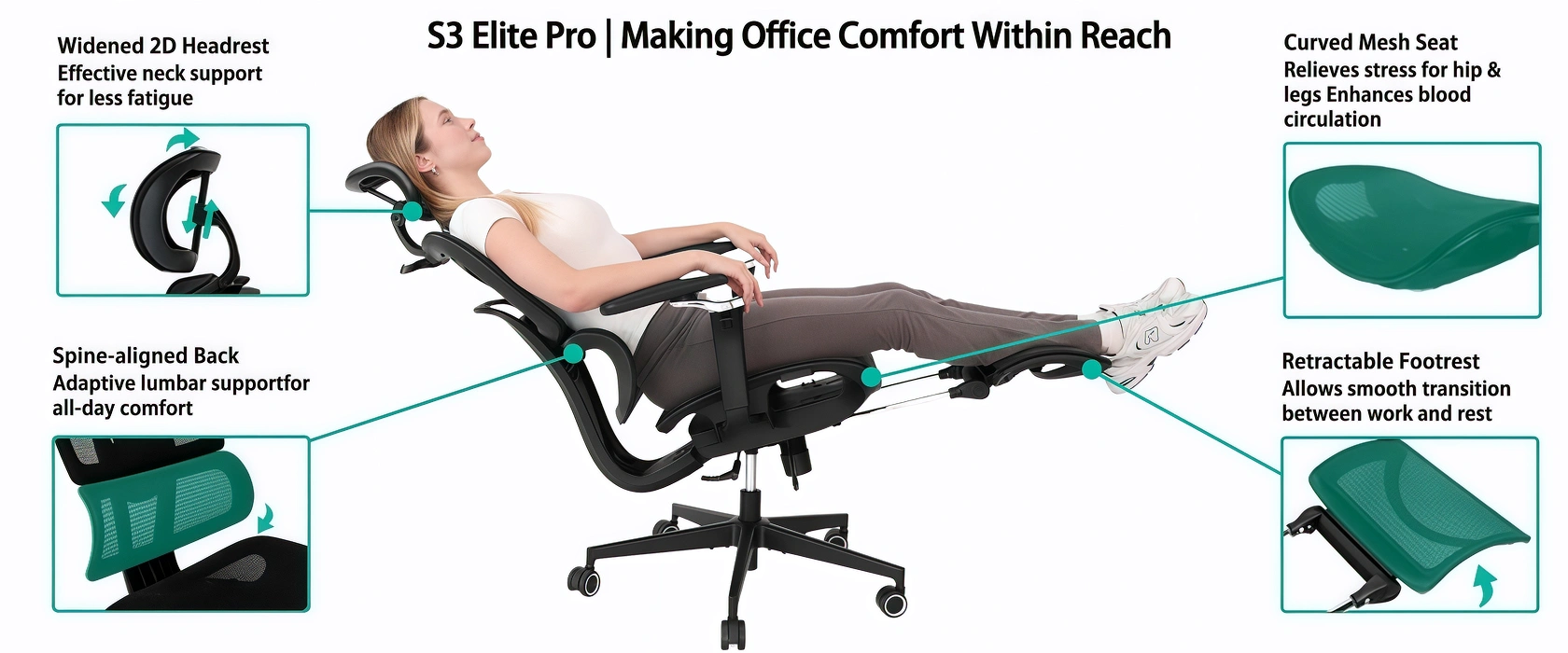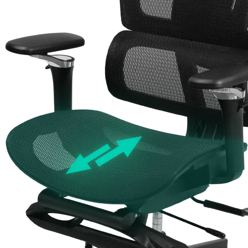 - This chair adapts to you—featuring a 2D adjustable headrest, adaptive lumbar support, seat depth control, 145° reclining backrest, and 18-inch retractable mesh footrest.