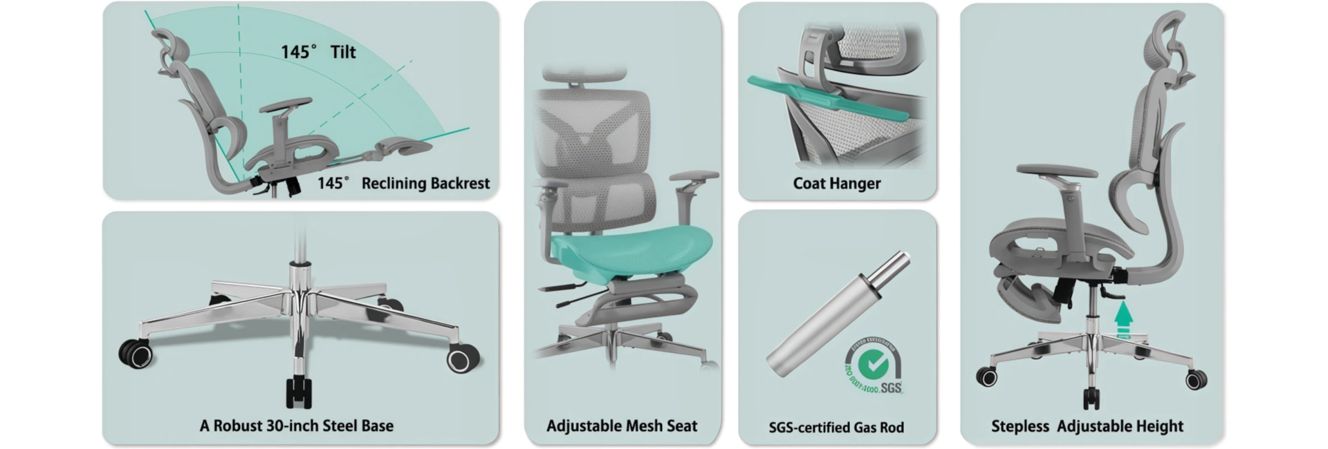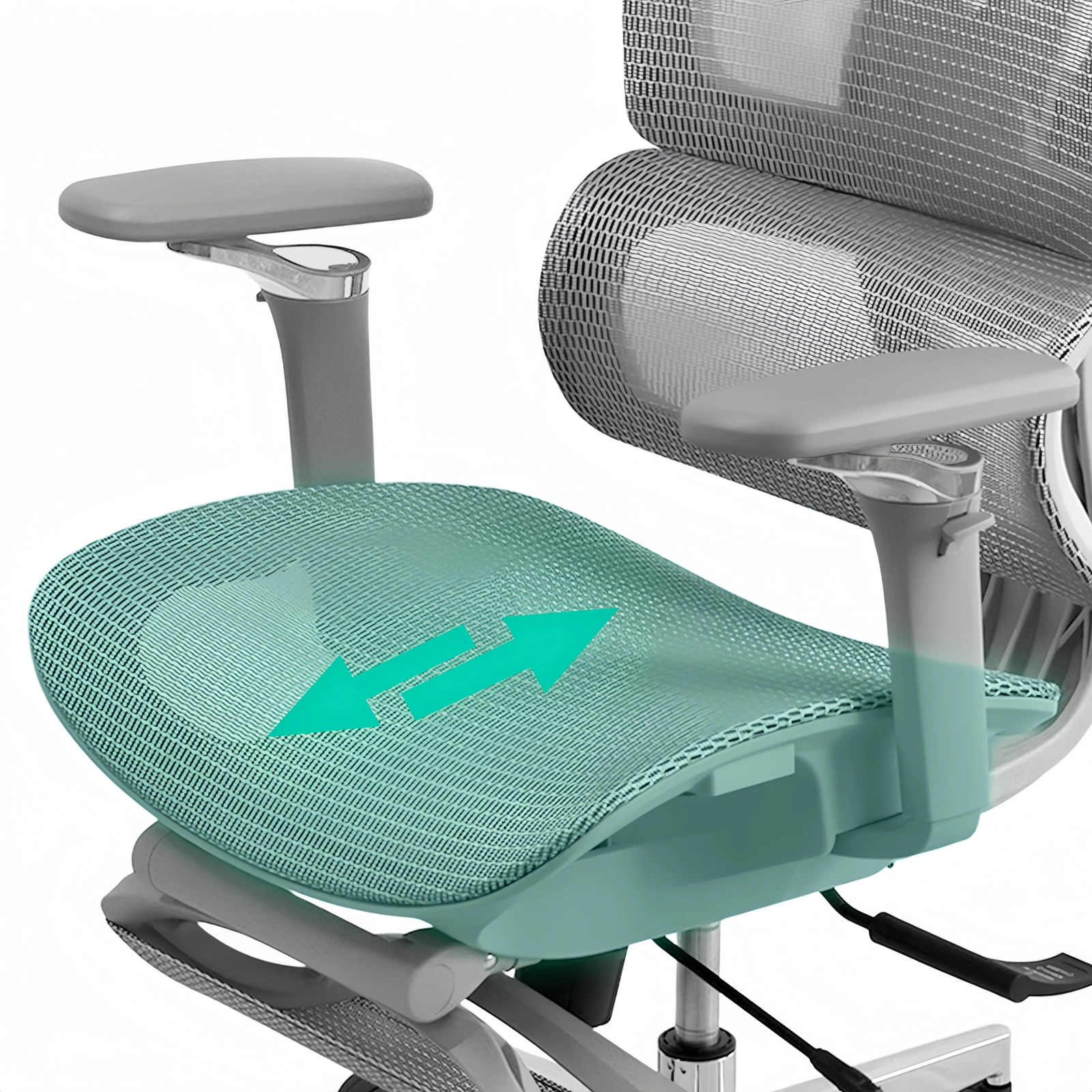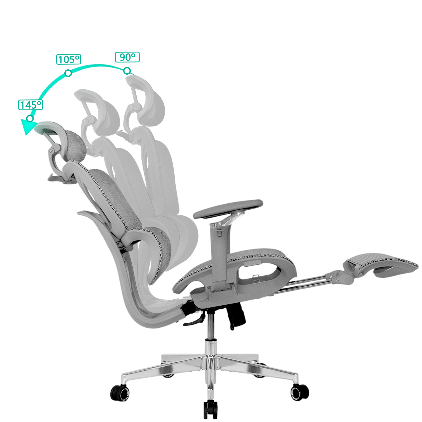- This chair adapts to you—featuring a 2D adjustable headrest, adaptive lumbar support, seat depth control, 145° reclining backrest, and 18-inch retractable mesh footrest.