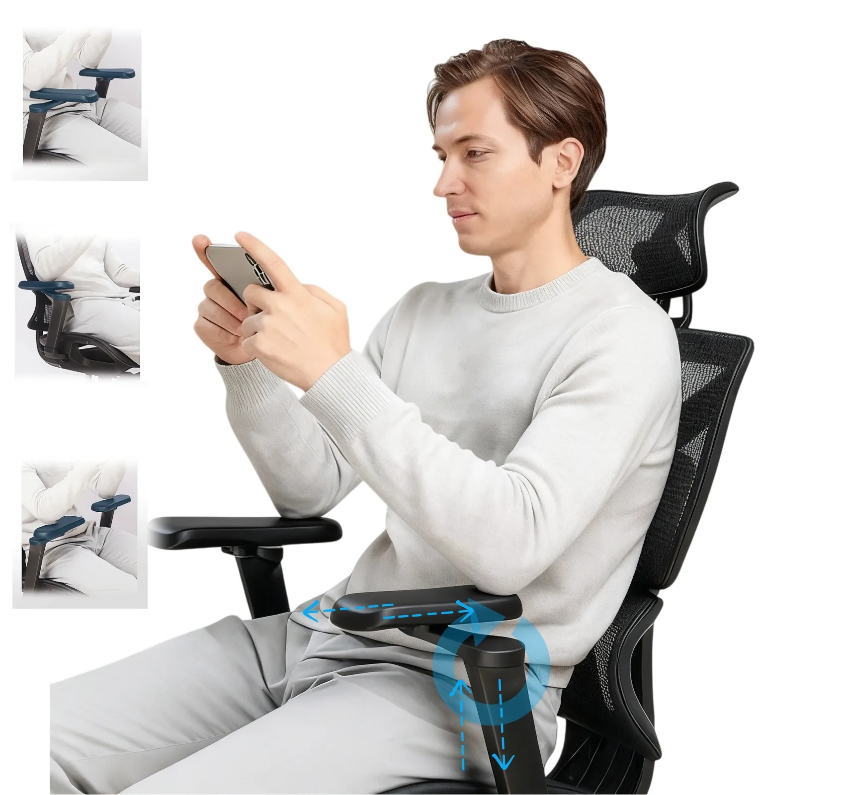 Soft yet supportive armrests with multi-directional adjustments ease arm strain whether working, reading, or relaxing.